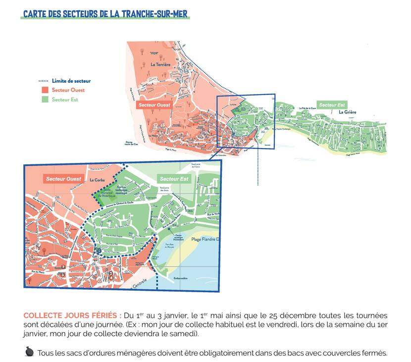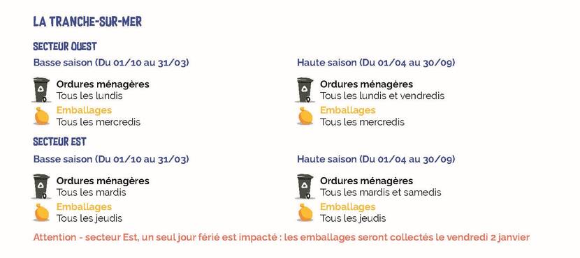 La Tranche sur Mer est découpée en 2 secteurs de collecte selon le calendrier et les types de déchets ci-dessous. Les ordures ménagères et les emballages sont collectés en porte-à-porte. Le verre et les papiers doivent être déposés dans les points d’apport volontaire.Passage à la redevance incitative